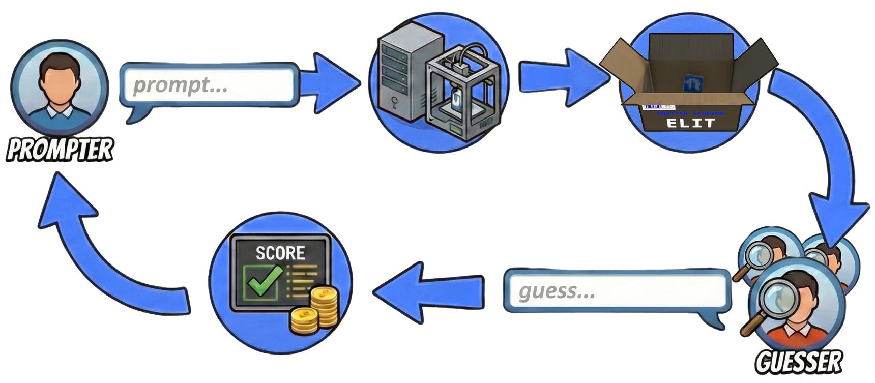 ELIT combines text prompting, 3D object generation, and guessing a hidden concept into a fun, fast-paced multiplayer game.
